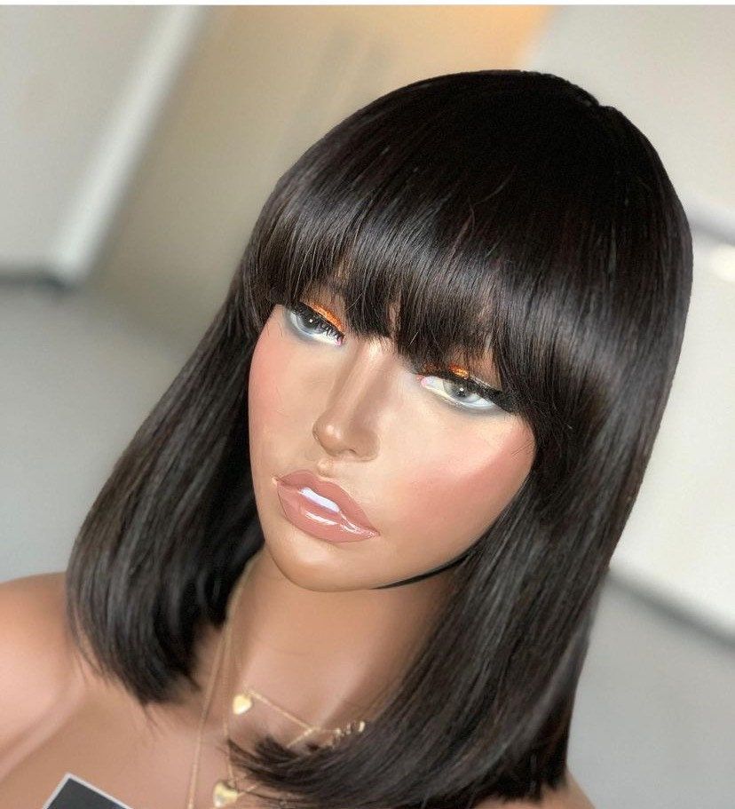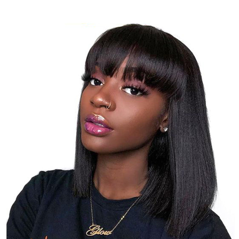 1. 100% Human Virgin Hair Natural Black Color Glueless Bob Curly Weave Wigs with Bangs.